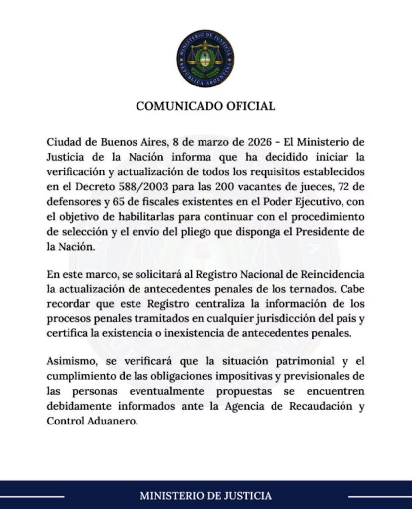 El comunicado oficial difundido por el Ministerio de Justicia confirmó que se pondrá en marcha la verificación de antecedentes y requisitos correspondientes a las vacantes existentes dentro del sistema judicial federal.