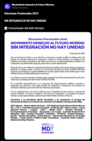 La carta, difundida bajo el título “Sin integración no hay unidad”, fue emitida por la sede de Moreno del MDF. Allí se manifiesta el rechazo a una lista de concejales y consejeros escolares que, según denuncian, no incluye representación de su espacio. El documento expresa una crítica directa hacia la jefa comunal, cercana al kirchnerismo y referenciada políticamente con La Cámpora y Máximo Kirchner.