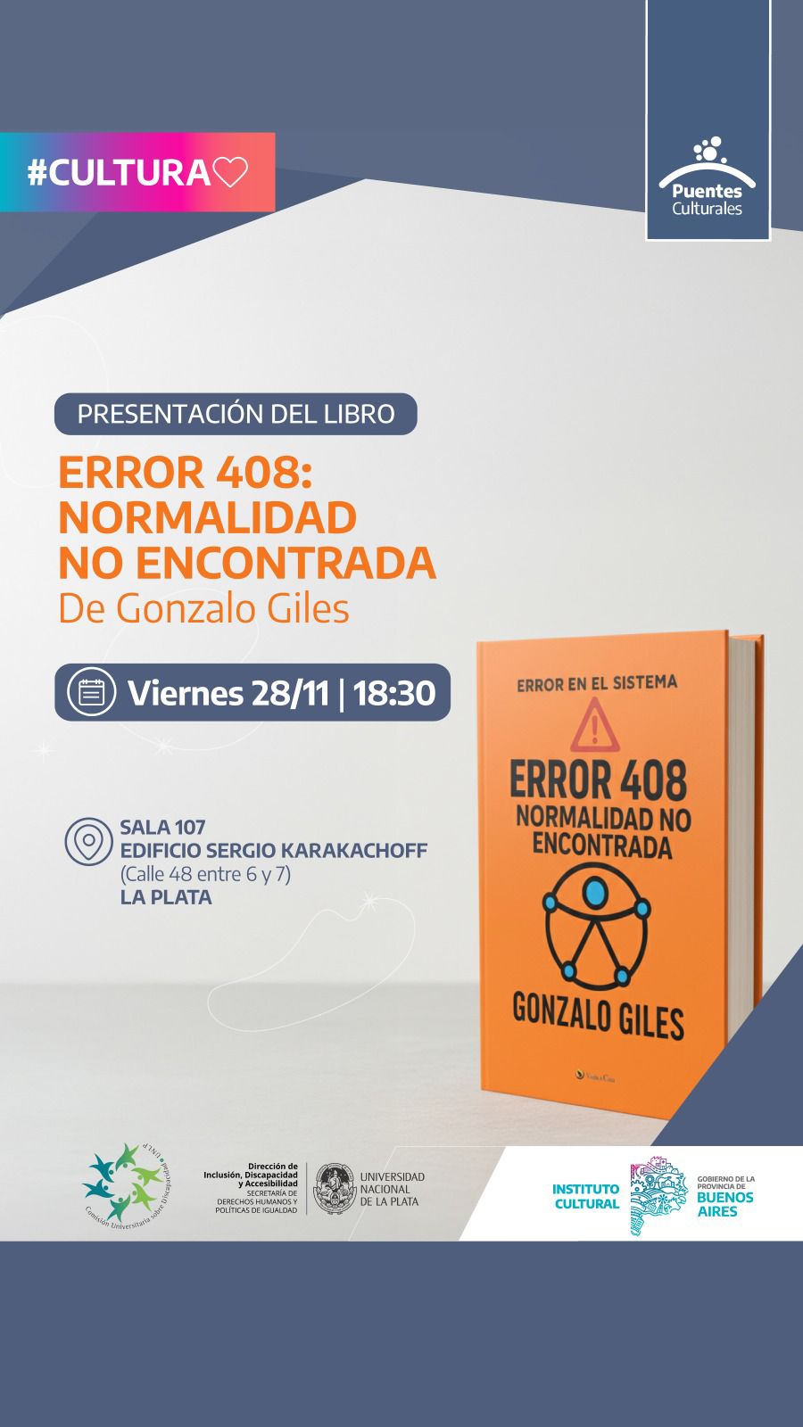 El próximo viernes 28 de noviembre, a las 18:30 horas, en el Edificio Karakachoff de la Universidad Nacional de La Plata (calle 48 entre 6 y 7, Sala 107), Gonzalo Giles, reconocido periodista, escritor y divulgador de comunicación alternativa y aumentativa, estará presentando su último libro «Error 408: Normalidad no encontrada».