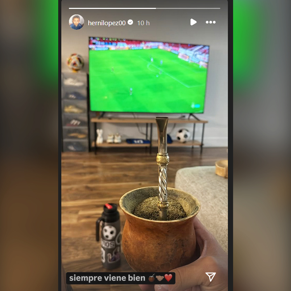 En la imagen, aparentemente inofensiva, se ve a López Muñoz tomando mate con la leyenda «siempre viene bien» y, de fondo, ¡un partido de fútbol! ¿Cuál? Nada más y nada menos que Huracán vs. Estudiantes.
