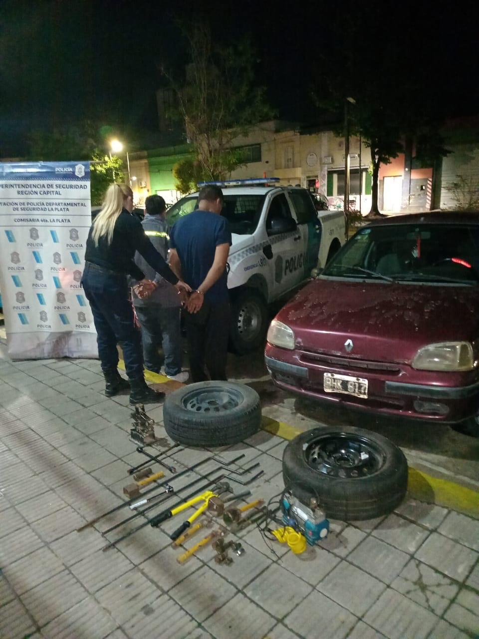 Dentro del Renault Clio, los policías encontraron dos ruedas de auxilio completas, presuntamente sustraídas minutos antes, además de una gran cantidad de herramientas específicamente utilizadas para el robo de neumáticos. Entre los elementos secuestrados había una tijera de corte, una llave cruz, varillas de hierro, tornillos de seguridad, piezas de fabricación casera adaptadas para forzar sistemas antirrobo y un compresor. La presencia de este equipamiento refuerza la hipótesis de que no se trataba de un hecho aislado, sino de personas con experiencia en esta modalidad delictiva.